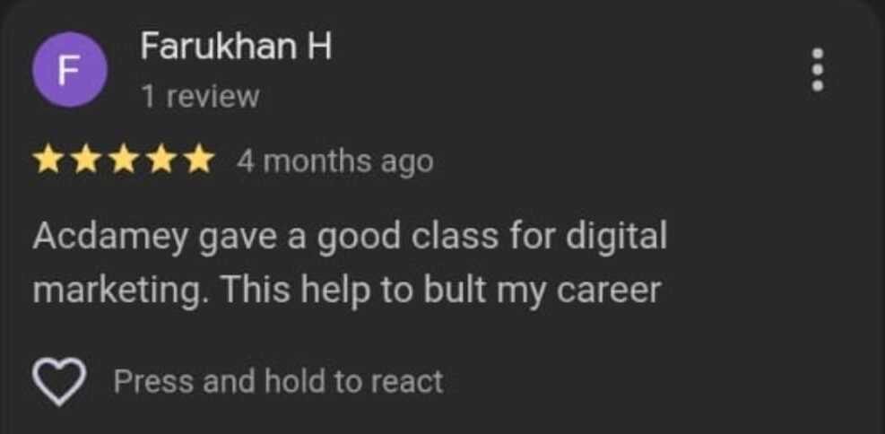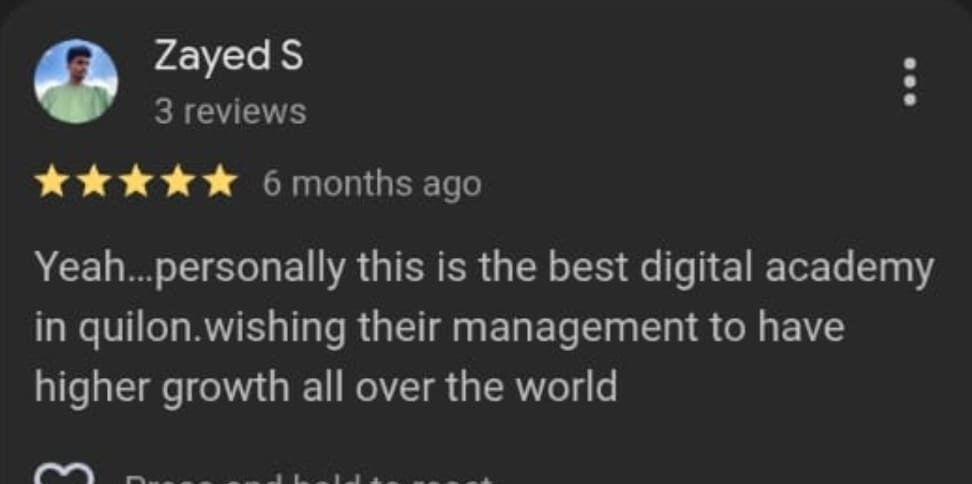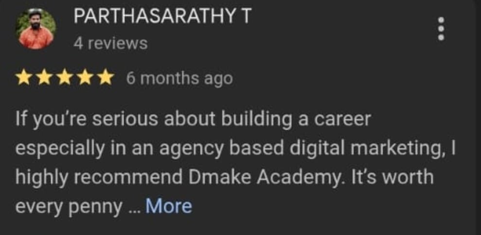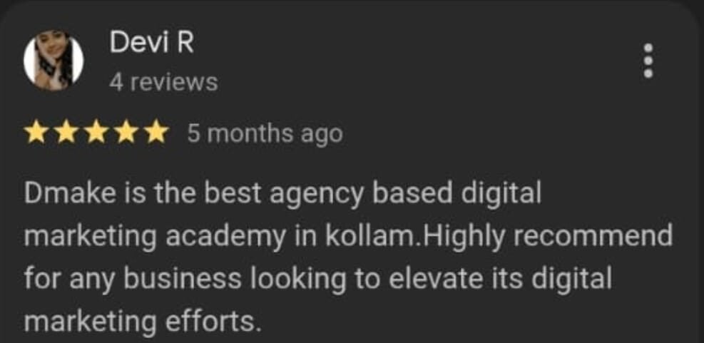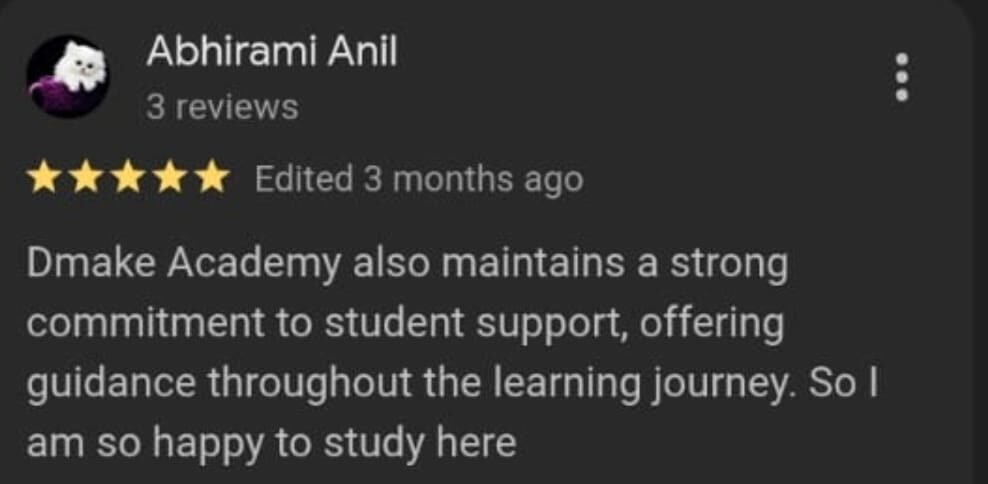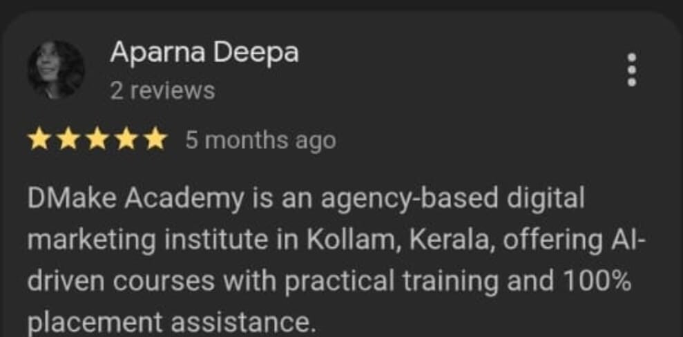 At Dmake Academy, student success is our top priority. Our Google reviews highlight the practical training, industry exposure, and career support that make us Kerala’s leading agency-based digital marketing and multimedia training institute.